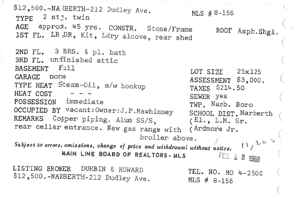 | 1913 | Built by (source: Atlas of Properties on Main Line Pennsylvania Railroad, A. H. Mueller, 1913) |