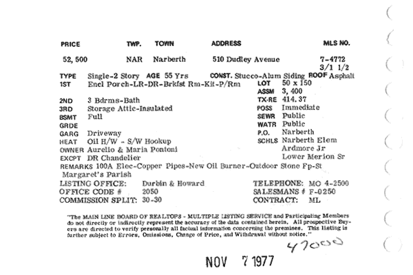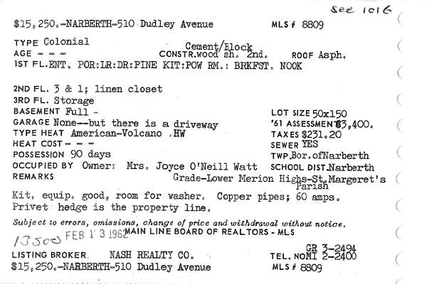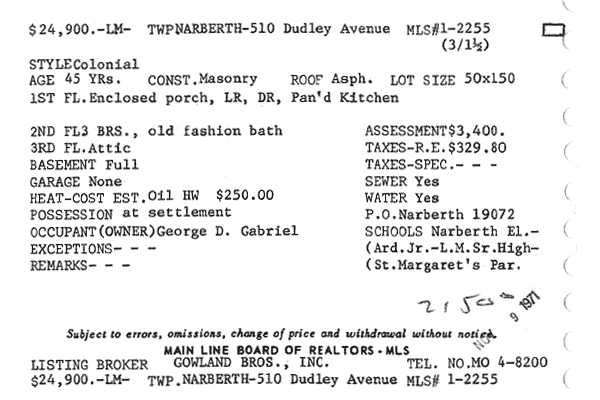 | 1919 | Built by (source: Atlas of Properties on Main Line Pennsylvania Railroad, A. H. Mueller, 1920; Narberth plate dated 1919) |