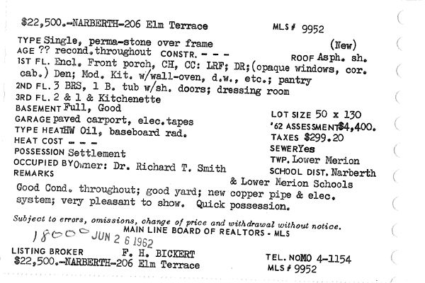 Main Line Board of Realtors listings 1949-90