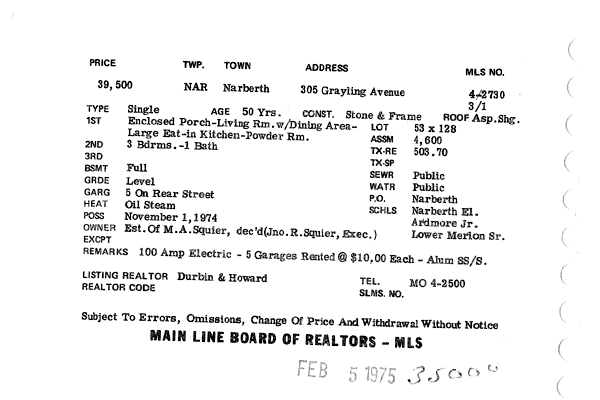 | 1913 | Built by (source: Atlas of Properties on Main Line Pennsylvania Railroad, A. H. Mueller, 1913) |