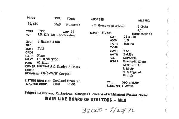 Main Line Board of Realtors listings 1949-90