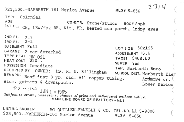 | 1919 | Built by (source: Atlas of Properties on Main Line Pennsylvania Railroad, A. H. Mueller, 1920; Narberth plate dated 1919) |