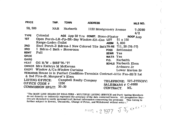 | 1919 | Built by (source: Atlas of Properties on Main Line Pennsylvania Railroad, A. H. Mueller, 1920; Narberth plate dated 1919) |
