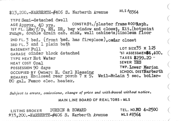 Main Line Board of Realtors listings 1949-90