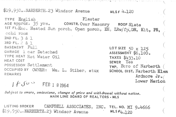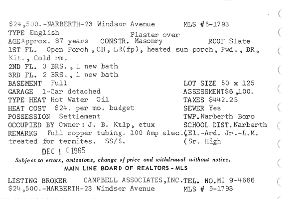 Main Line Board of Realtors listings 1949-90
