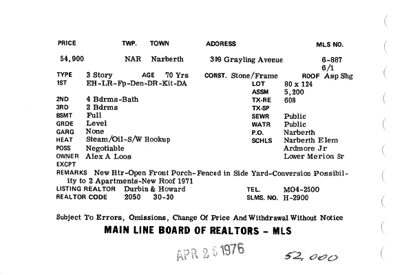 | 1913 | Built by (source: Atlas of Properties on Main Line Pennsylvania Railroad, A. H. Mueller, 1913) |